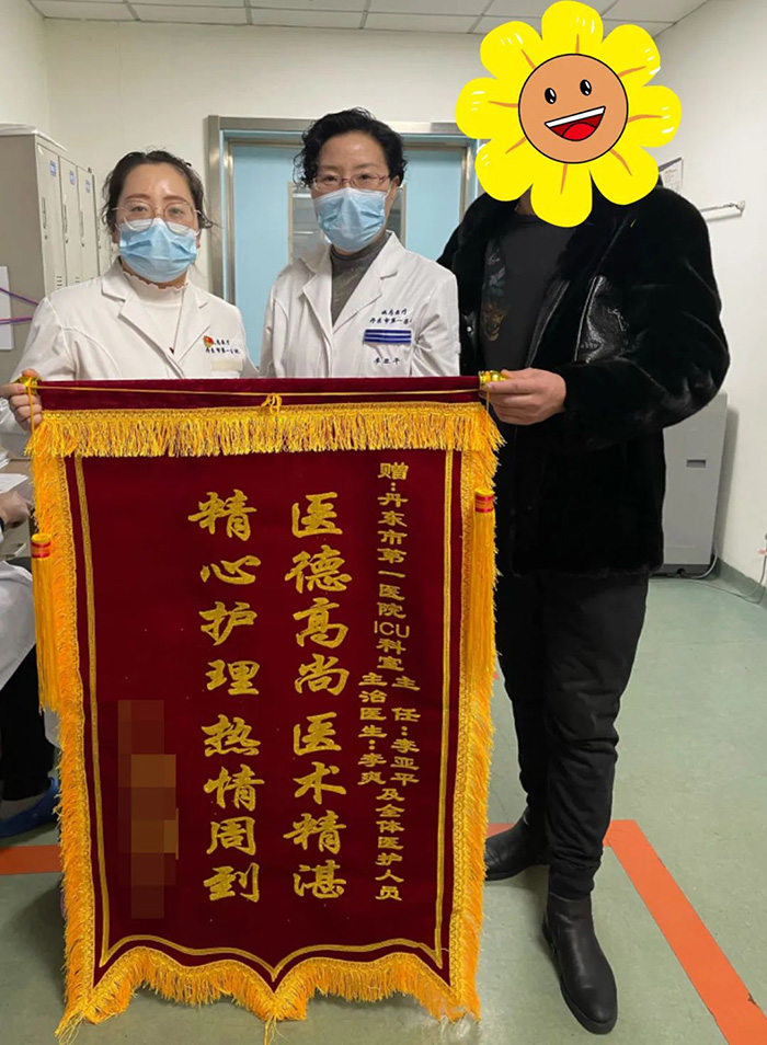 去年6月,一位全身插满管子的危重症患者从北京转院回丹东,被送往我院诊治,恰逢李爽值班。在初次接诊时,拥有十余年重症医疗工作经验的她立刻意识到患者的情况不容乐观。通过详细了解病史,她得知该患者曾在北京的一家知名医院被宣告病情极为危重,难以康复。患者家属不愿放弃,辗转回到了丹东。李爽看到患者家属的悲伤神情,感同身受,决定放手一搏,尽自己最大的努力来挽救患者生命。她与科室主任李亚平及医疗团队共同讨论治疗方案,查阅大量国内权威文献,每日密切关注患者病情变化,日以继夜地深入研究患者的病因和制定科学合理的治疗方案。在经过两个多月的精心治疗后,患者的病情逐渐稳定,各项指标恢复正常,达到出院标准,最终安全地回到了家中。患者家属的感激之情溢于言表,为了表达谢意,专门制作赠送了一面感谢锦旗,拉着李爽的手流下了激动和感谢的眼泪。