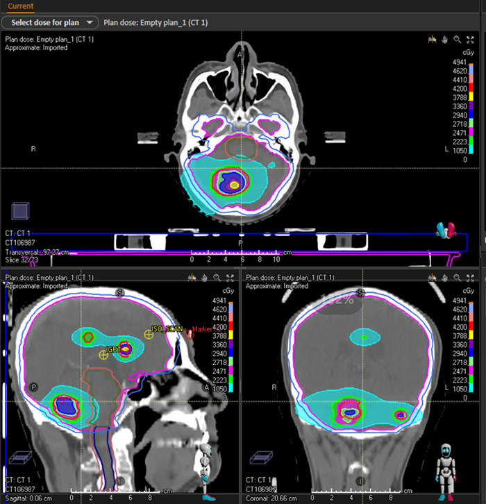 我院放疗科医疗团队,依托TaiChiPro放射治疗设备,在脑转移瘤、宫颈癌、肺癌、胰腺癌等几十例病例治疗中发现给予相应的同步推量放射治疗,取得了较好的临床治疗效果。在同一体位下的选择同步推量治疗方法,放射治疗靶区选择更为精准,减少了二次定位会给治疗靶区造成的偏差,保证了治疗的效果,缩短了治疗时间,也节省了治疗费用。