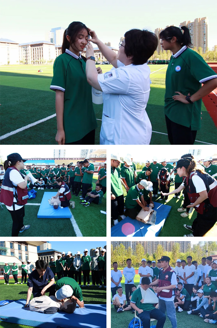 活动期间,我院30余位应急医疗队和教学护理小组成员,融入到9个学生方队,通过真人演示、模型人教具操作等方式,在现场进行“一对一、手把手”式教学。对心肺复苏、海姆立克急救法、外伤包扎等应急急救措施进行了规范操作和要点讲解。参加活动的师生们积极参与现场互动,对他们提出的各种疑问,我院医护专家们也进行了细致专业的解答。