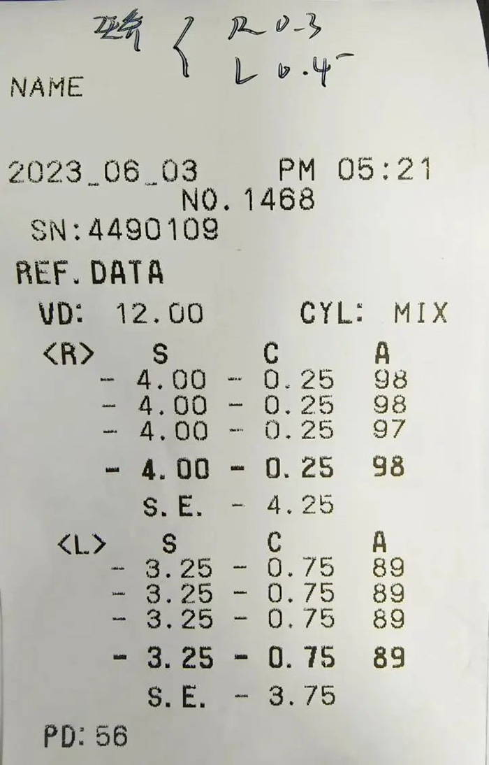 下图是丹东市第一医院眼科做完电脑验光后的一张完整的验光单:验光单最上方的信息是做检查的日期时间、检查编号和姓名信息。