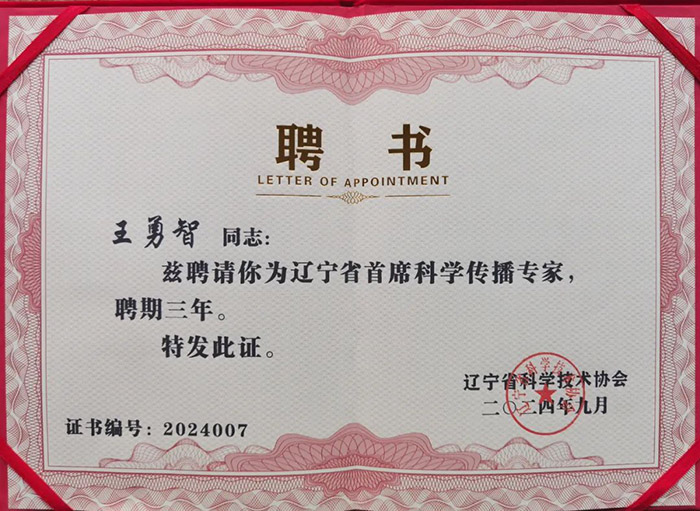 在2024年省科协聘任的43名辽宁省首席科学传播专家中,仅有5名是由地级市科协推荐入选,丹东市占3名,我院王勇智副院长为其中1名。这也是丹东市科技工作者自2021年省科协评聘首席科学传播专家以来首次获此殊荣。