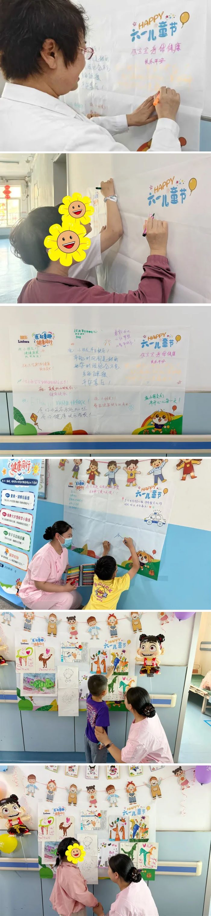 医生、护士、患儿及家长们,俯身在画布前写下真挚的的祝福,五彩的寄语汇成一片爱的海洋。门诊和病房的小朋友都积极的参与到绘画墙的创作中,孩子们用五彩画笔描绘心中的医疗世界:有的画出像城堡一样的医院,有的还创作出了“病毒小怪兽被药液小勇士打败的童话故事。