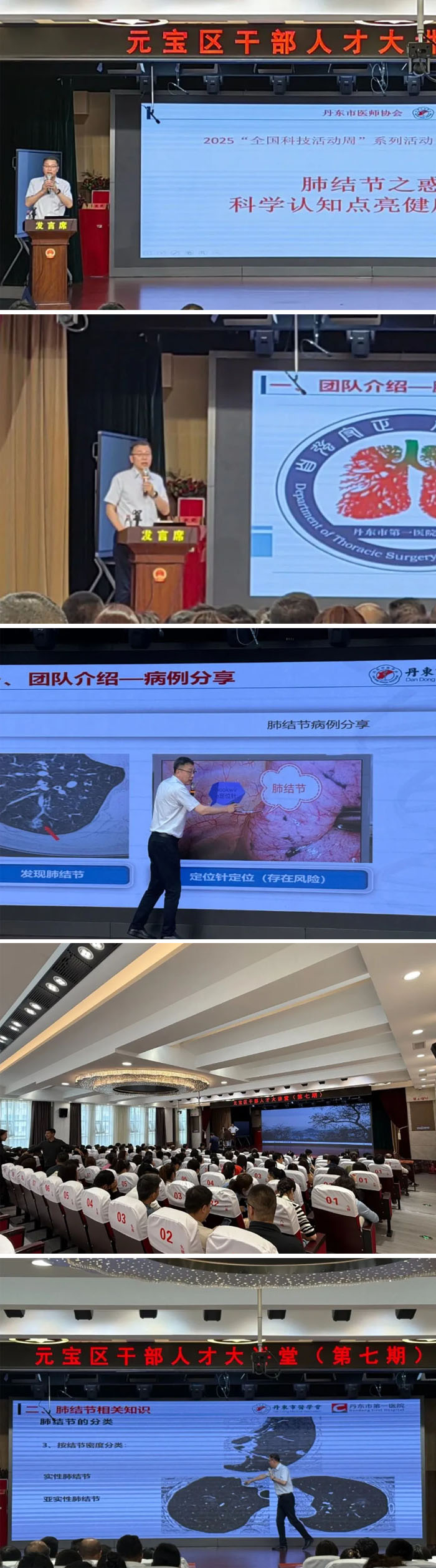5月28日,我院王勇智副院长来到元宝区干部人才大讲堂,以《肺结节之惑:科学认知点亮健康之路》为题,为参会者详细宣教讲解了肺癌防治相关内容。科普宣教中,王勇智副院长通过大量的真实病历解析,将晦涩难懂的医学科学知识,以浅显易懂的图文和影音等方式,生动形象地讲授给大家。