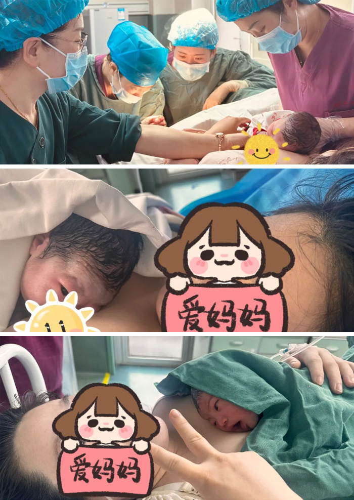 分娩后,助产士即刻进行母婴之间的“早接触、早吸吮”,帮助宝宝吃到宝贵的第一口初乳。宝宝在获得了无可替代的免疫保护的同时,更为后续的母乳喂养奠定了基础,也保证了母婴之间完整的情感连接。