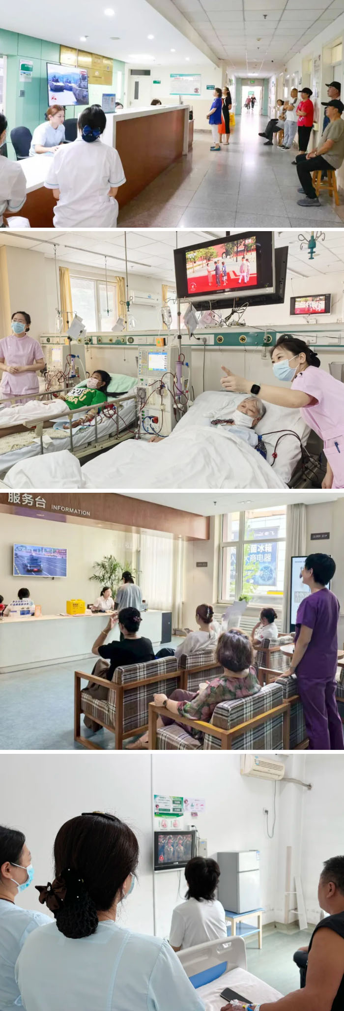 医护人员在交班间隙、工作休息时间,通过会议室、医生办公室、护士站等场所的电视和移动设备收看庆典。各个病区纷纷开启直播设备让住院患者也能观看庆典盛况。
