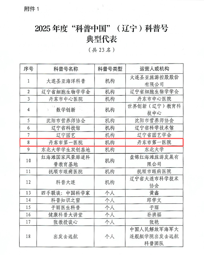 近日,辽宁省科学技术协会正式公布 2025 年度“科普中国”(辽宁)及“科普辽宁”科普号和科普创作者典型代表名单。我院凭借在健康科普领域的深耕细作与卓越成效,从全省众多参评机构中脱颖而出,获此殊荣,成为丹东地区卫生健康系统科普工作的典型代表。