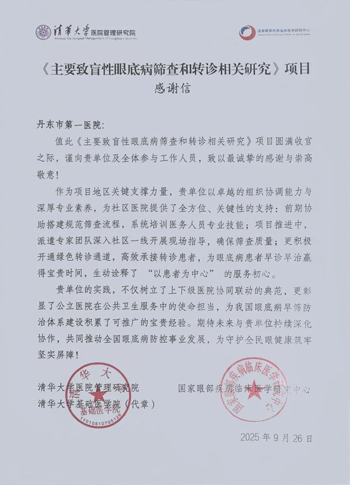 近日,我院眼科收到了一封来自清华大学医院管理研究院与国家眼部疾病临床医学研究中心联合发出的感谢信。信中对医院在《主要致盲性眼底病筛查和转诊相关研究》项目中的关键支撑作用与突出贡献表示高度认可与诚挚感谢。这不仅是对我院眼科专业能力的肯定,更是对我院积极承担公共卫生责任、扎实推进眼健康服务的有力印证。