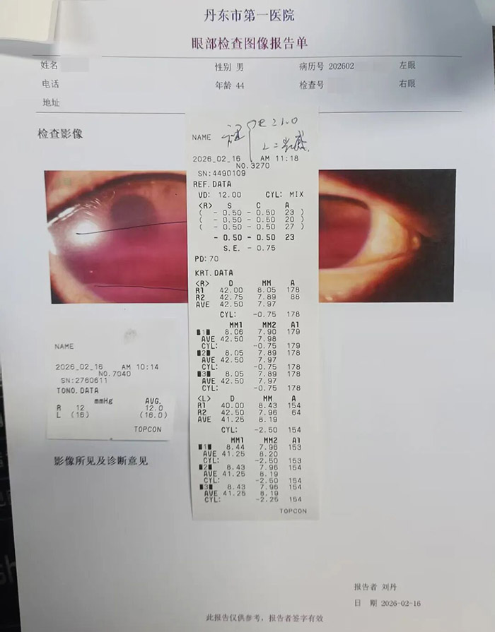 剧烈的疼痛和瞬间模糊的视线让杨先生慌了神,家人立刻驱车,紧急赶往我院眼科。接诊的李新伊医生第一时间为他做了检查,结果令人担忧:杨先生的左眼睑有一道约1厘米长的浅层皮肤裂伤,眼睑明显水肿,眼内前房出血,当时左眼视力只剩下“感光”。面对惊慌失措的杨先生和家人,李医生一边迅速进行止血、清创消毒处理,一边耐心解释病情和治疗措施:“出血会慢慢吸收,视力有很大希望恢复,您先别太担心……”专业而温暖的话语,让杨先生紧绷的情绪渐渐放松下来。