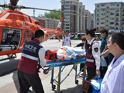 2018年5月23日10点50 分,随着一阵直升机的轰鸣声,一架莱奥纳多AW119型专业医疗机构的救援直升机70QU平稳地降落在丹东市第一医院八道院区旁,元宝山公园广场。早已做好准备的丹东市第一医院医疗小组将外伤骨折的老年重症患者平稳的推送到直升机上。