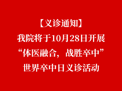 今年的10月29日是第19个世界卒中日。为进一步普及卒中防治知识,降低社会卒中负担,倡导体医融合的健康理念,我院神经内科将于10月28日开展“体医融合,战胜卒中”主题义诊活动,欢迎广大市民朋友积极参与。