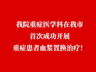 近日,我院重症医学科成功开展丹东市首例重症患者血浆置换治疗。标志着丹东市重症医学专业在血液净化技术方面又上了一节新的台阶!为丹东市百姓们的健康又增添了一道安全屏障!