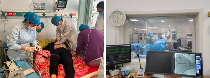 近日,一名59岁男性患者,在家里持续心绞痛发作,家里人看患者病情越来越严重,紧急送到了心内二科入院治疗。患者在家里发过烧,现在咳嗽还有痰咳不出,家人心急如焚。心内二科的医护们先是稳住患者家属的情绪,以“心绞痛”收治入院,经过一系列检查,诊断为冠心病、急性心肌梗死。极有可能发生再梗猝死的风险。心内二科的医生们立即进行了病例讨论,迅速为这位患者制定了对症的治疗方案——心导管支架手术。手术医生宫兆滨副主任、崔福胜,都是发着低烧,忍着全身的酸痛,克服手术难度大、手术时间长等困难,通力协作,顺利完成手术,把患者从生死线上拉了回来。