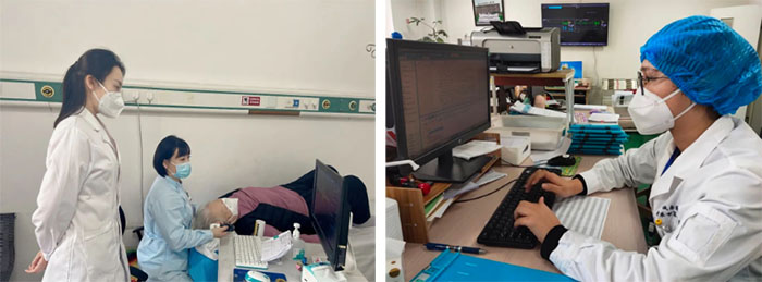最近科里因新冠感染继发心脏病入院的患者特别多,有时候一天晚上就能收治20多位患者,医生面临的巨大工作压力也和护士一样。副主任回振宇忍着病痛上台做手术,医生王泽川发烧38.5度,还在电脑前忙着电子病历,医生王义文、张旭也都是发烧带病忙碌。由于医务人员因病减员和工作激增,医生现在都是在超负荷工作,有的医生病房里查完房,紧接着又要立刻赶到门诊值班,为了减少患者的等待时间,电梯都来不及等,直接一路小跑从八楼病房跑到一楼门诊。可即使这样,科室医生们也一天都没耽误工作。