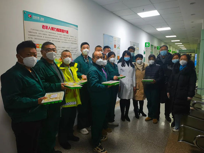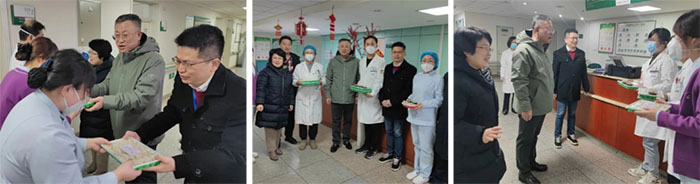 在送饺子的过程中,每到一处,院领导一行人都亲手将饺子送到值班医护手中,并送上新年的祝福!随着忙碌身影的穿梭,一份份暖心饺子、一个个新年祝福送到了值班人员的手中、心里,温暖着大家的心!