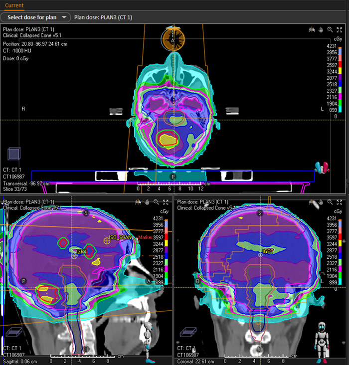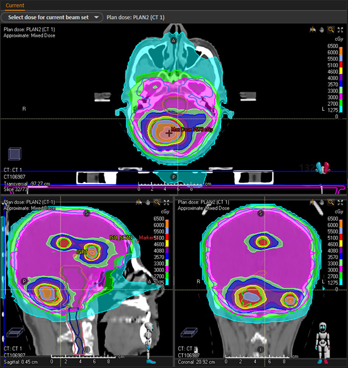 我院放疗科医疗团队,依托TaiChiPro放射治疗设备,在脑转移瘤、宫颈癌、肺癌、胰腺癌等几十例病例治疗中发现给予相应的同步推量放射治疗,取得了较好的临床治疗效果。在同一体位下的选择同步推量治疗方法,放射治疗靶区选择更为精准,减少了二次定位会给治疗靶区造成的偏差,保证了治疗的效果,缩短了治疗时间,也节省了治疗费用。