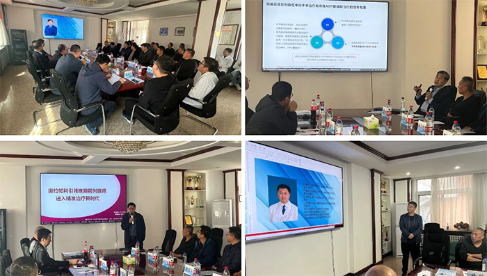 在会议的学术交流环节,毕建斌教授、曾宇教授、刘校吾教授、丹东市中心医院泌尿外科侯征、丹东市第一医院泌尿外科刘毅、东港市中心医院孙晨旭等医疗专家,分别以《从2023年CSCO指南更新看前列腺癌内分泌治疗的新进展》、《奥拉帕利引领晚期前列腺癌进入精准治疗新时代》、《机器人辅助腹腔镜手术Trocar布局和常见的并发症》、《子宫内膜节育器穿入膀胱继发膀胱结石的治疗策略》、《双镜联合复杂尿路结石病例分享》、《肾脏恶性肿瘤伴腔静脉癌栓的手术分享》为题,做了专题讲座。交流中,各位讲者无私分享了对目前极具前沿视角和临床价值的学术见解与经验,为参会人员带来了前列腺癌指南更新全解、精准治疗前列腺癌方向、机器人手术讲解等精彩病例实操分享。专家们倾囊相授,参会人员认真聆听,共同打造了一场学术氛围浓厚的饕殄盛宴。针对与会人员感兴趣的话题,专家们还进行了互动交流,现场讨论热烈、学术氛围浓厚。