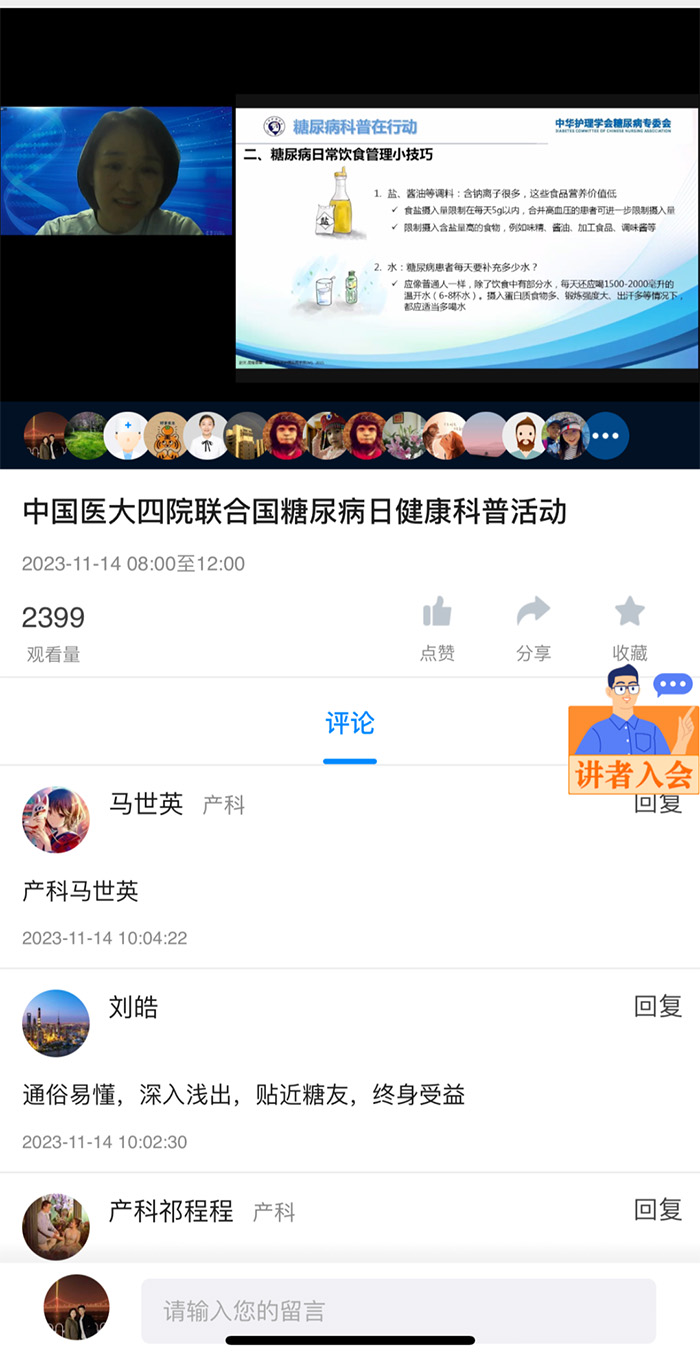 11月14日上午,中国医科大学附属第四医院主办的健康科普活动,以“线上+线下”形式召开,我院内分泌科护士长陶璐,作为“中国医科大学附属第四医院专科护理联盟”的委员,在线上出席了活动,并以《糖尿病的饮食护理》为题,向参会者详细讲解相关科普知识。