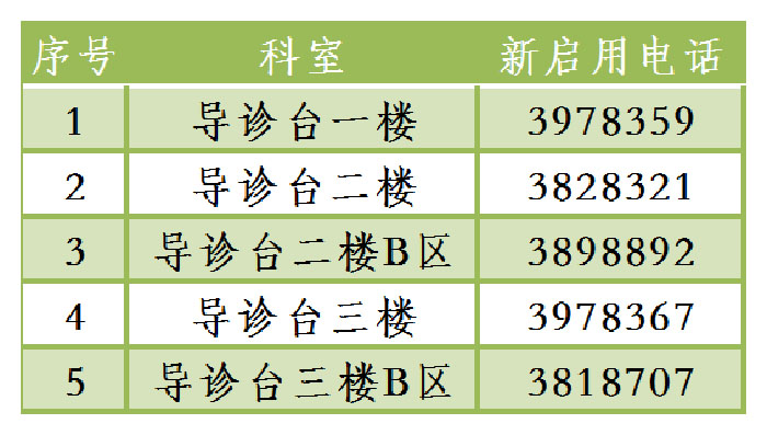 ​​​​​​​      新电话号码将于12月1日全面启用,同时原电话号码停用。如需来电请拔打新启用电话号码。望广大市民及患者知悉!近期因网络施工改造可能造成原电话无法拨通,给您带来的不便敬请谅解。