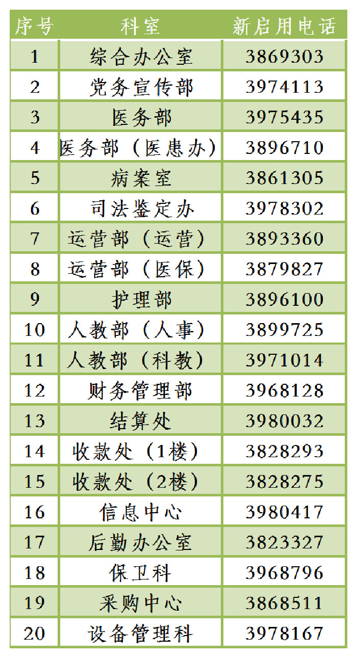 因工作需要,现将我院办公电话号码变更情况公告如下: