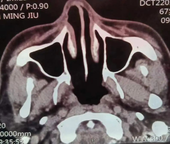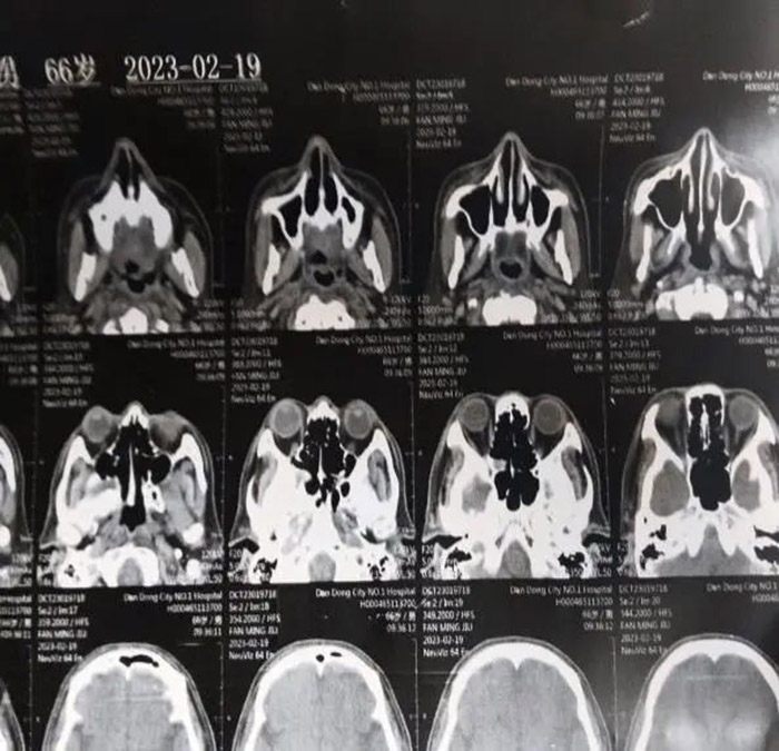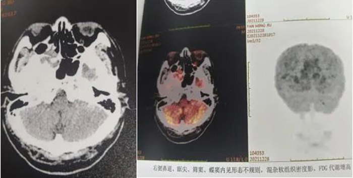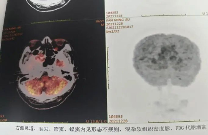 2021年7月,这是患病的第七年,范先生发现自己的右眼逐渐视物不清,原以为只是年龄的问题老花眼或眼疲劳。但是从眼球逐渐外凸后,他开始紧张起来。在家人的陪伴下,范先生来到我院检查病情。鼻咽部CT显示:鼻咽癌复发,PET/CT结果显示:筛窦蝶窦有浸润、鼻腔转移、眼球外凸系肿瘤变大外张导致。