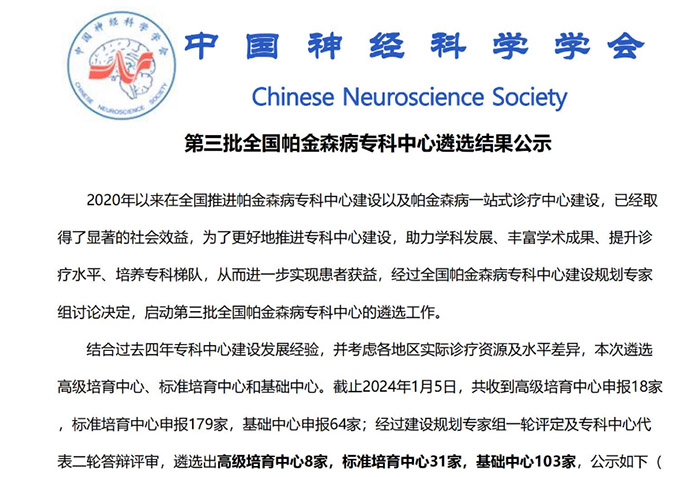日前,中国神经科学学会公布了第三批全国帕金森病专科中心遴选结果,丹东市第一医院成功入选全国帕金森病专科基础中心。本次入选,标志着我院帕金森诊治水平已达到省内先进水平,医院的管理水平和医疗服务质量,迈上了新的台阶!