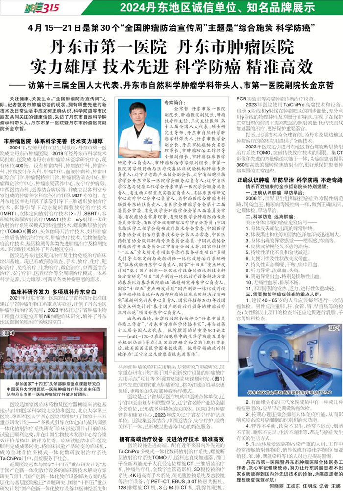 肿瘤防治宣传周期间我院通过多种媒体平台进行科普宣传。丹东市自然科学肿瘤学科带头人,丹东市第一医院副院长,肿瘤放疗科主任金京哲在接受丹东广播电视台采访时,为市民详细介绍了恶性肿瘤的三级预防,如何改变不健康的生活方式。我院同时在丹东广播电视报对恶性肿瘤的早诊早治,科学防控进行了详细的讲解,将专业知识转化为群众喜闻乐见的科普常识,提高群众对癌症预防筛查和早诊早治的认知和接受度,切实降低癌症带来的社会危害和疾病负担。