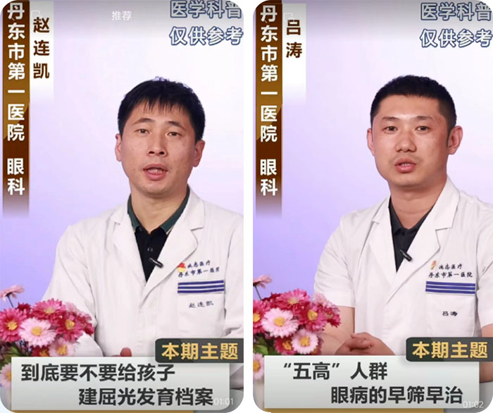 我院眼科赵连凯副主任和吕涛副主任医师,拍摄了三期系列视频讲座。视频内容一方面着眼于年轻朋友,对青少年的近视防治要点,以及层出不穷的近视治疗方式的选择和优势进行了详细讲解;另一方面面向光大青壮年及高龄患者,讲述“五高,即高血压、高血糖、高血脂、高度近视和高龄对眼底的影响,针对我国日益增长的眼底病患者的现状和眼底病慢病新型管理模式着重讲解。目前点击量已达2000+,并在持续增长。