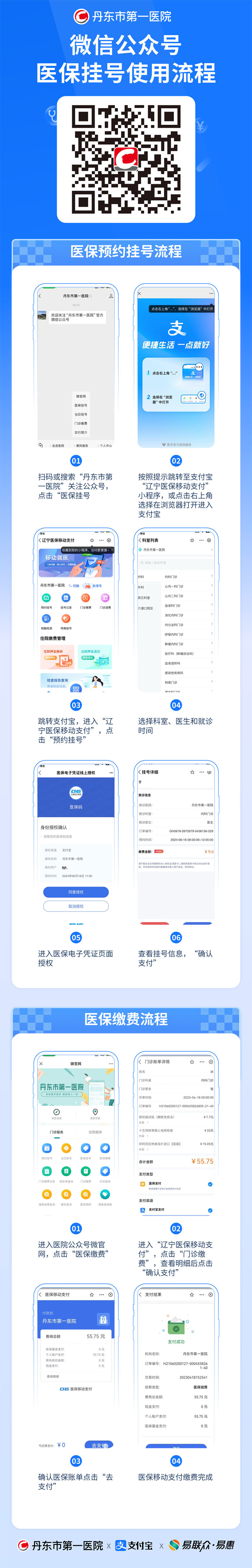 为方便群众就医,在省、市医保局的大力持下,丹东市第一医院把医保缴费窗口搬进参保人的手机里,只需手机点一点,就能完成医保移动支付,让参保群众就医过程更方便、更便捷、更省时!