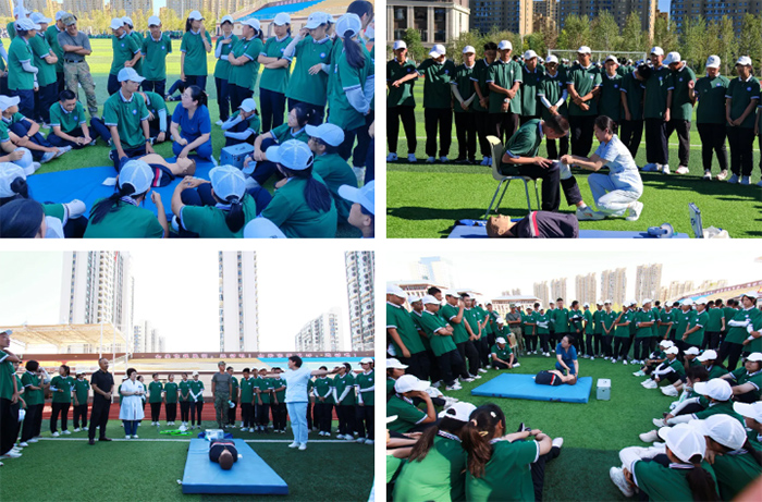 活动期间,我院30余位应急医疗队和教学护理小组成员,融入到9个学生方队,通过真人演示、模型人教具操作等方式,在现场进行“一对一、手把手”式教学。对心肺复苏、海姆立克急救法、外伤包扎等应急急救措施进行了规范操作和要点讲解。参加活动的师生们积极参与现场互动,对他们提出的各种疑问,我院医护专家们也进行了细致专业的解答。