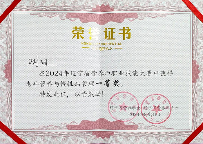 8月31日,备受瞩目的“辽宁省营养师职业技能大赛”在沈阳盛大举行。我院营养师王丹阳从六百余位报名选手中脱颖而出,在决赛中与全省近百位选手同台竞技。她凭借扎实的理论基础和过硬的实操能力,顺利通过“理论与技能综合考核”初赛,并在“实操技能”决赛中出色发挥,最终斩获本次大赛“老年营养与慢性病管理组”一等奖!