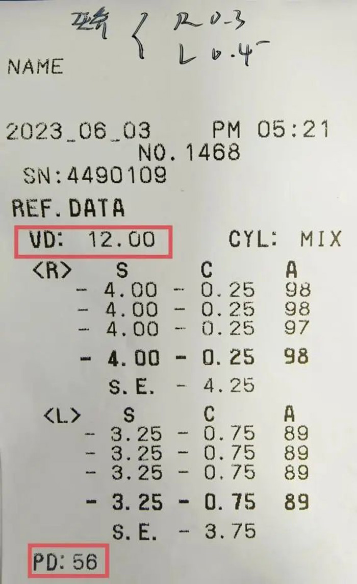 其他数据:VD、PD VD是指镜眼距(表示测试距离),这个距离就跟我们平时戴眼镜时从镜片到角膜顶点的距离差不多。