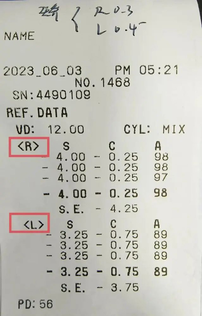 下图是丹东市第一医院眼科做完电脑验光后的一张完整的验光单:验光单最上方的信息是做检查的日期时间、检查编号和姓名信息。