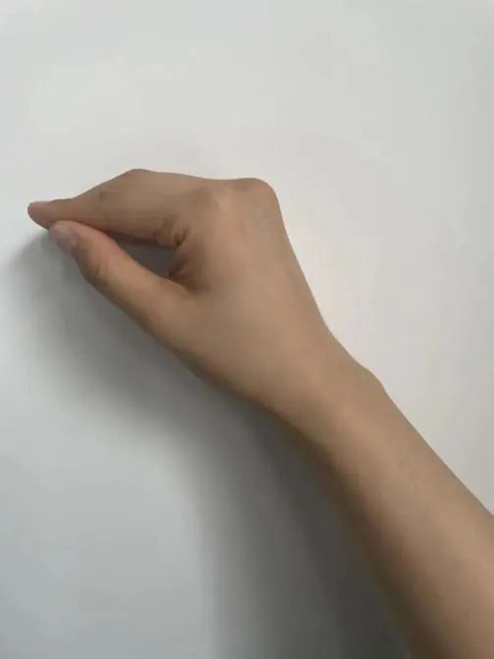 2.家长将手固定呈背隆状,手掌中空,手指弯曲,拇指仅手掌中空,手指弯曲,拇指紧靠食指。