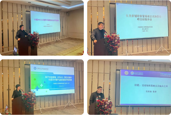 在学术交流环节,来自中国医科大学附属盛京医院胸外科的韩云教授、徐然教授、王宁教授和范崇渝教授,分别对《III期非小细胞肺癌围手术期治疗进展》、《免疫新辅助食管癌根治术胸骨后为何经验体会》、《基于快速康复(ERAS)理念对胸外科围术期气道管理的护理策略》、《流域地形图概念及临床应用》等专题进行了精彩讲座和经验分享。