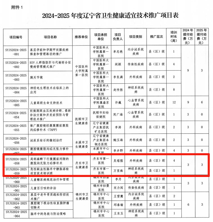 日前,省卫生健康委公布了“2024—2025年度辽宁省卫生健康适宜技术推广项目表”。由我院党委副书记、副院长、普通外科主任吴瑶强主持开展的“局部麻醉下行腹膜前间隙的腹股沟无张力疝修补术”,以及由神经内科一病区主任万里姝主持开展的“急性缺血性脑卒中静脉溶栓适宜技术培训班”两项新技术,被辽宁省卫生健康委确认为适宜技术推广项目,并在全省推广。此两项新技术也是我市卫健系统2024—2025年度仅有的获批成为适宜技术推广项目。