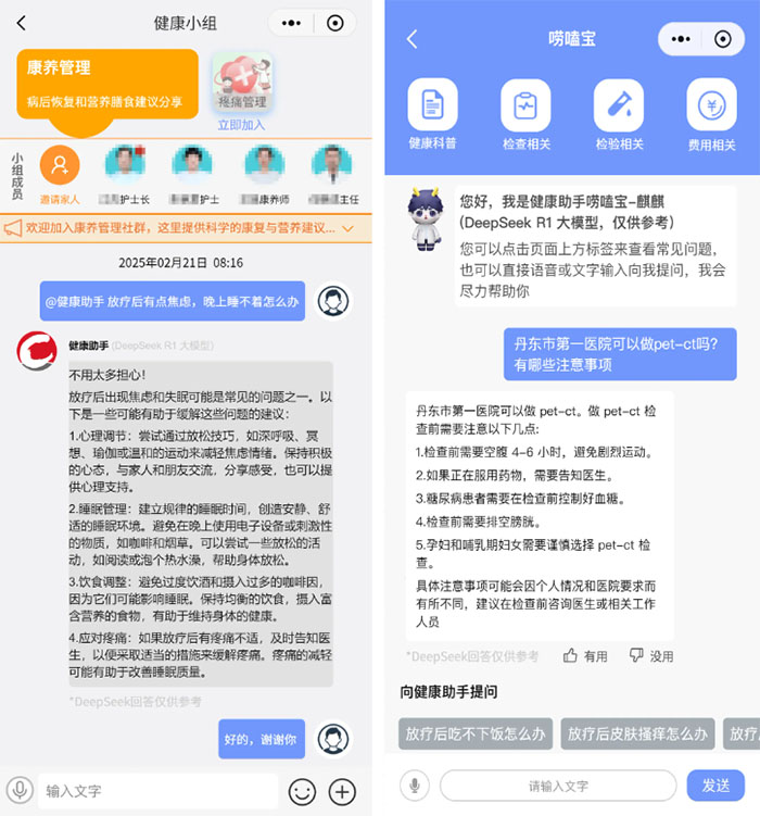 在医疗科技日新月异的今天,我院以前瞻性的视野和创新的勇气,于2月18日在辽宁省内率先实现了医疗服务与人工智能的深度融合,将我院“丹东肿瘤”小程序接入DeepSeek大模型,为肿瘤患者带来了一场前所未有的智能化医疗革命。