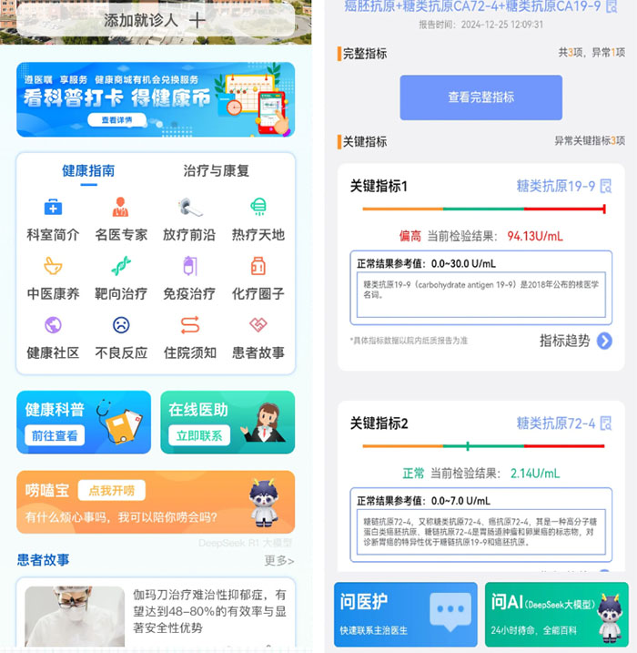 DeepSeek大模型能够根据患者的实时生理指标和治疗效果反馈,智能调整治疗方案,实现动态管理,极大地提高了患者的就医体验。同时,该模型还能深度融入患者的全病程管理,提供涵盖报告解读、饮食建议及运动指导等方面的个性化健康管理方案。小程序内的24小时智能问询服务,可以随时解答患者的日常问题,全方位守护患者健康。