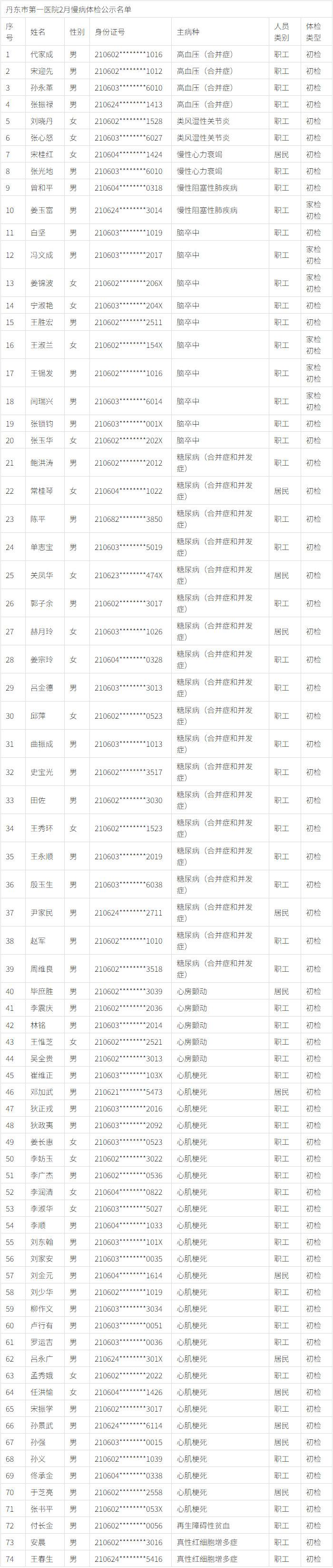 按照丹东市医疗保障局、丹东市医保中心门诊慢特病体检工作统一部署,现将丹东市第一医院2025年2月门诊慢特病集中体检认定合格名单进行公示。本次公示的体检合格人员于2025年3月起享受相应门诊慢特病待遇,请自行查询。