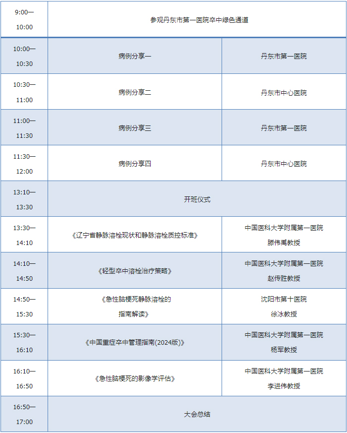 首期培训班(含开班仪式)将于2025年5月7日在丹东第一医院举办。本期培训将邀请来自国内、省内脑血管病领域的著名专家学者进行学术讲座。培训内容涉及缺血性卒中静脉溶栓领域最新研究进展、指南解读、质控指标、卒中中心建设、重症卒中患者的管理等热点问题。培训班同时设有典型案例分析和现场参观环节,为参加培训学员开拓视野、提升理论知识的同时,强化感性认识,提高丹东及周边地区静脉溶栓技术的整体开展质量及水平,让更多患者受益。