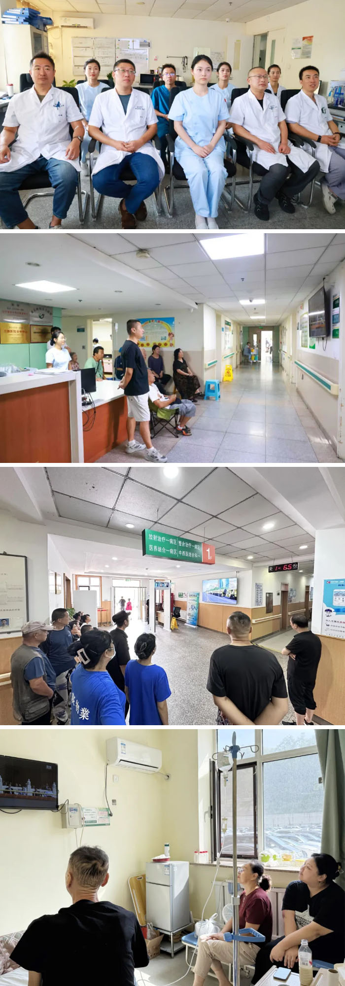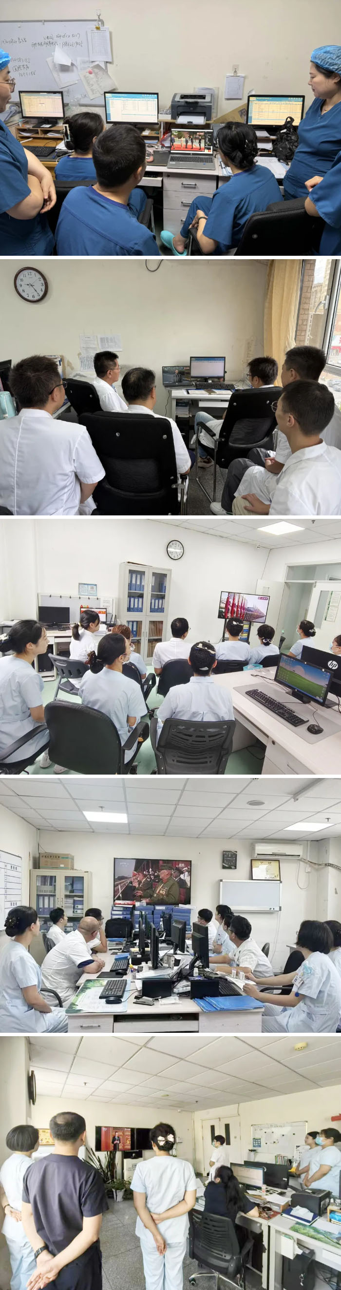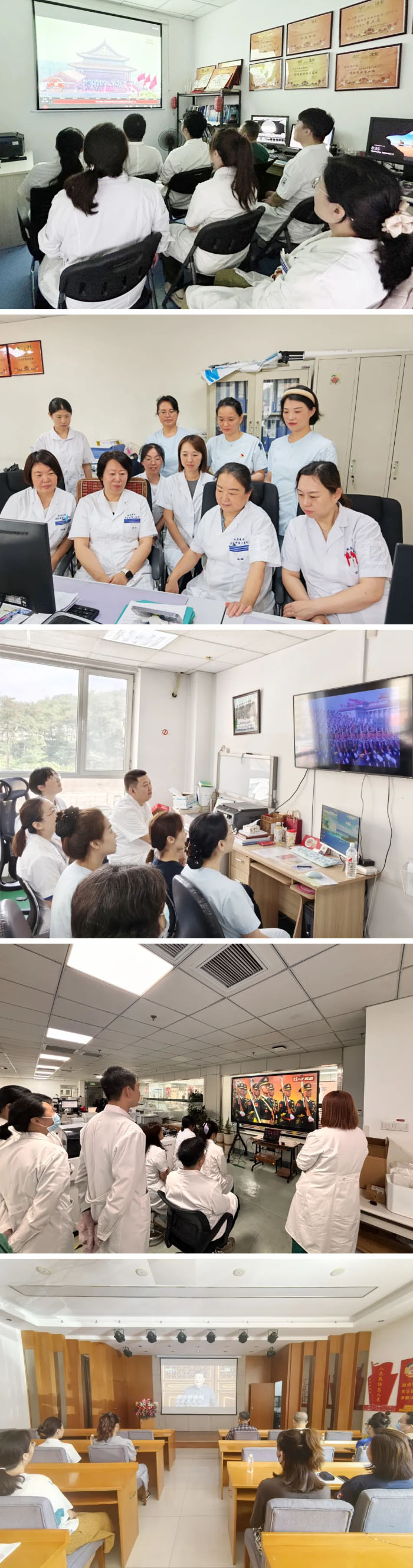 医护人员在交班间隙、工作休息时间,通过会议室、医生办公室、护士站等场所的电视和移动设备收看庆典。各个病区纷纷开启直播设备让住院患者也能观看庆典盛况。