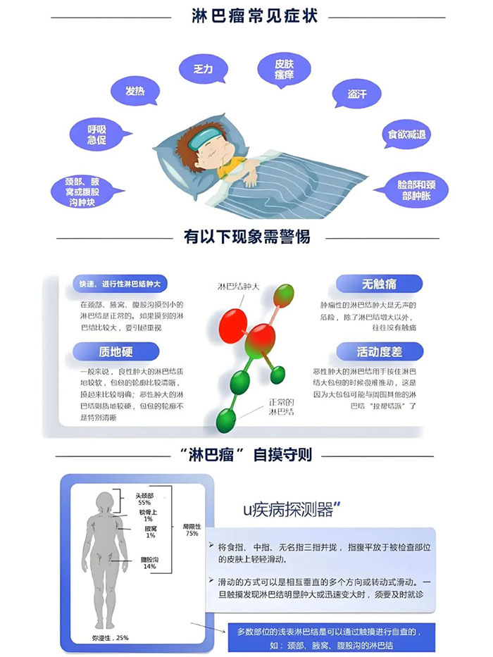 淋巴瘤是起源于淋巴造血系统的恶性肿瘤,主要表现为无痛性淋巴结肿大,常见于颈部、锁骨上窝、腹股沟淋巴结肿大,全身各组织器官均可受累,可伴有发热、盗汗、体重减轻、瘙痒等全身症状。如今,淋巴瘤的治疗已经从“化疗时代”转变到“精准靶向与免疫时代”,部分患者可选用“无化疗方案”,治疗策略不断优化,部分患者可以实现深度缓解和长期生存,生活质量大幅提高。