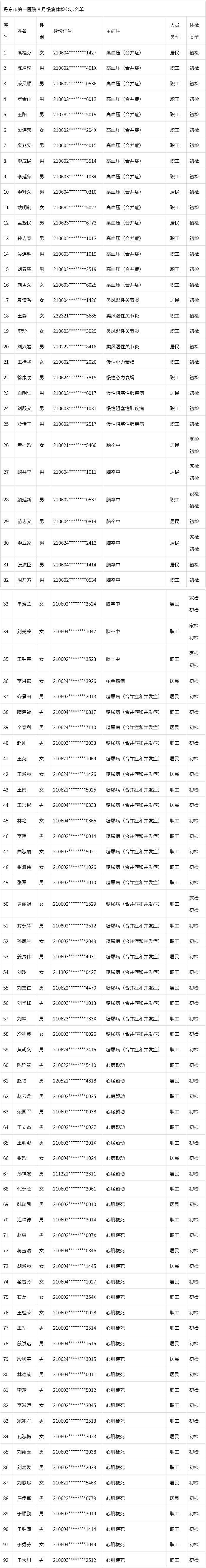 按照丹东市医疗保障局、丹东市医保中心门诊慢特病体检工作统一部署,现将丹东市第一医院2025年8月门诊慢特病集中体检认定合格名单进行公示。本次公示的体检合格人员于2025年9月起享受相应门诊慢特病待遇,请自行查询。