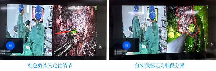 术中游离切断供应“目标肺段”的动脉分支,静脉注射吲哚菁绿,将胸腔镜开启荧光模式,显示出“目标肺段”和“健康肺段”的分界(图2染色的为健康肺段,即第二认证),并确保目标结节在“目标肺段”内,将目标肺段予以切除。