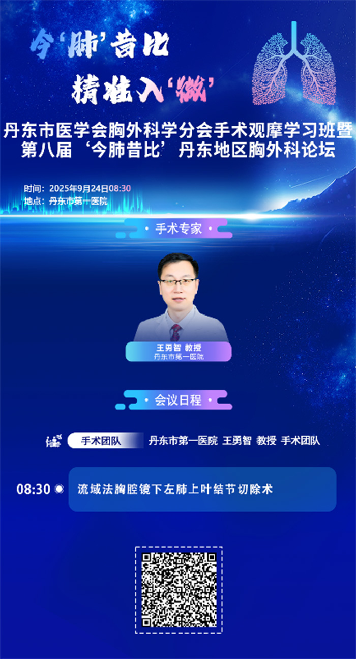 9月24日,在“丹东市医学会胸外科学分会手术观摩学习班暨第八届今'肺'昔比丹东地区胸外科论坛”上,我院副院长、胸外科主任王勇智率领医疗团队成功进行了“地形图流域法(ICG荧光染色法)+单孔胸腔镜联合亚段切除术手术”演示直播。
