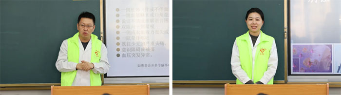 在丹东职专活动现场,科室医生孟庆贵和董雪分别以《话说脑卒中》和《别让“卒中”盯上年轻的你》为题进行科普讲座。讲座期间还积极与同学们进行互动问答,让大家在轻松的氛围中牢记关键知识点。本次活动还为同学们免费测量了血压、血糖,解答了大家的健康咨询。