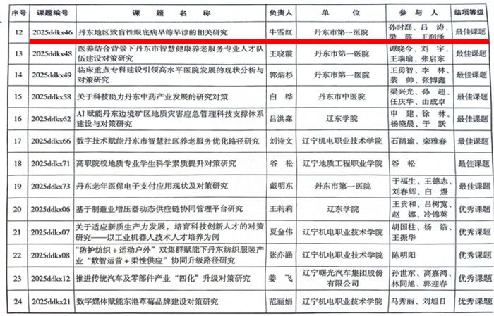 在此基础上,眼科医疗团队进一步将筛查数据汇总分析,形成《丹东地区致盲性眼底早期筛查与诊断决策建议》,该成果荣获丹东市2025年度科技创新智库项目最佳课题。团队持续优化筛查模型,结合人工智能辅助诊断技术,推动优质医疗资源下沉,为构建区域眼健康防治体系提供了可复制、可推广的“丹东经验”。