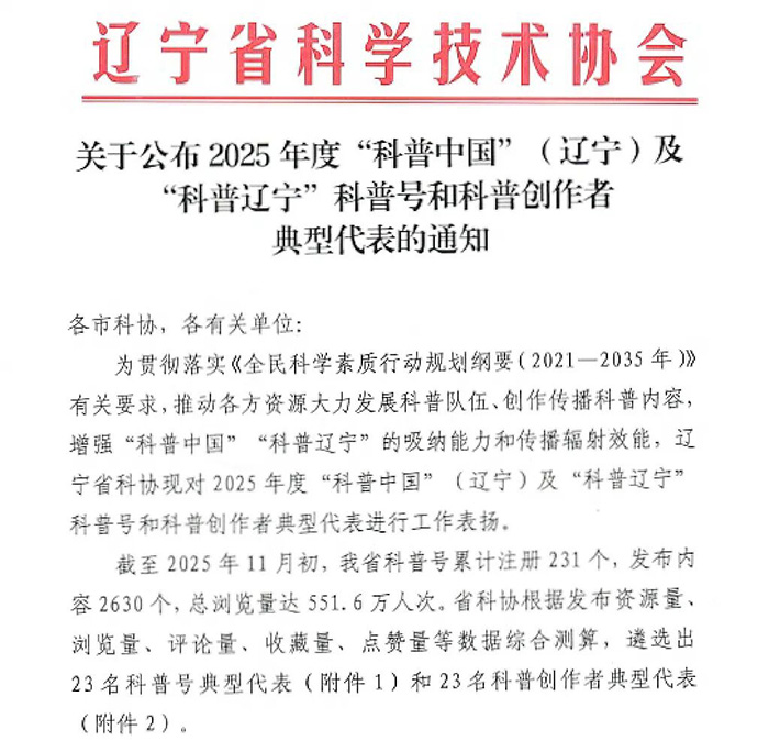 【喜报】我院获评 2025 年度 “科普中国”(辽宁)及“科普辽宁”科普号和科普创作者典型代表称号
