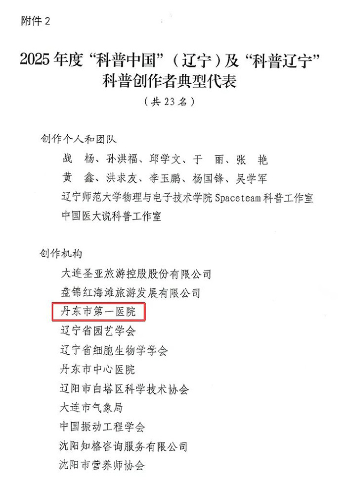 近日,辽宁省科学技术协会正式公布 2025 年度“科普中国”(辽宁)及“科普辽宁”科普号和科普创作者典型代表名单。我院凭借在健康科普领域的深耕细作与卓越成效,从全省众多参评机构中脱颖而出,获此殊荣,成为丹东地区卫生健康系统科普工作的典型代表。