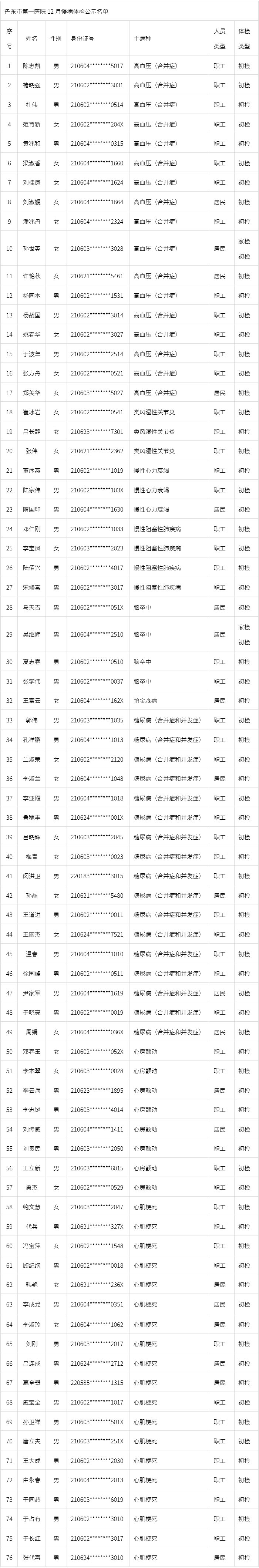 按照丹东市医疗保障局、丹东市医保中心门诊慢特病体检工作统一部署,现将丹东市第一医院2025年12月门诊慢特病集中体检认定合格名单进行公示。本次公示的体检合格人员于2026年1月起享受相应门诊慢特病待遇,请自行查询。