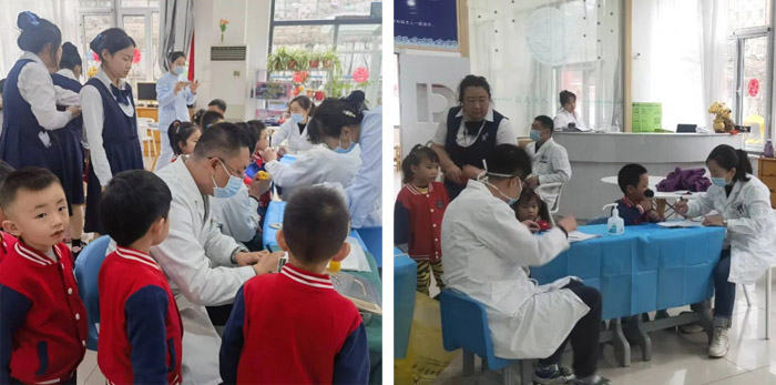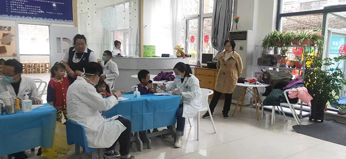 眼科医护人员黄海霞、刘丹、李乐、赵晓妍为孩子们进行视力检查。